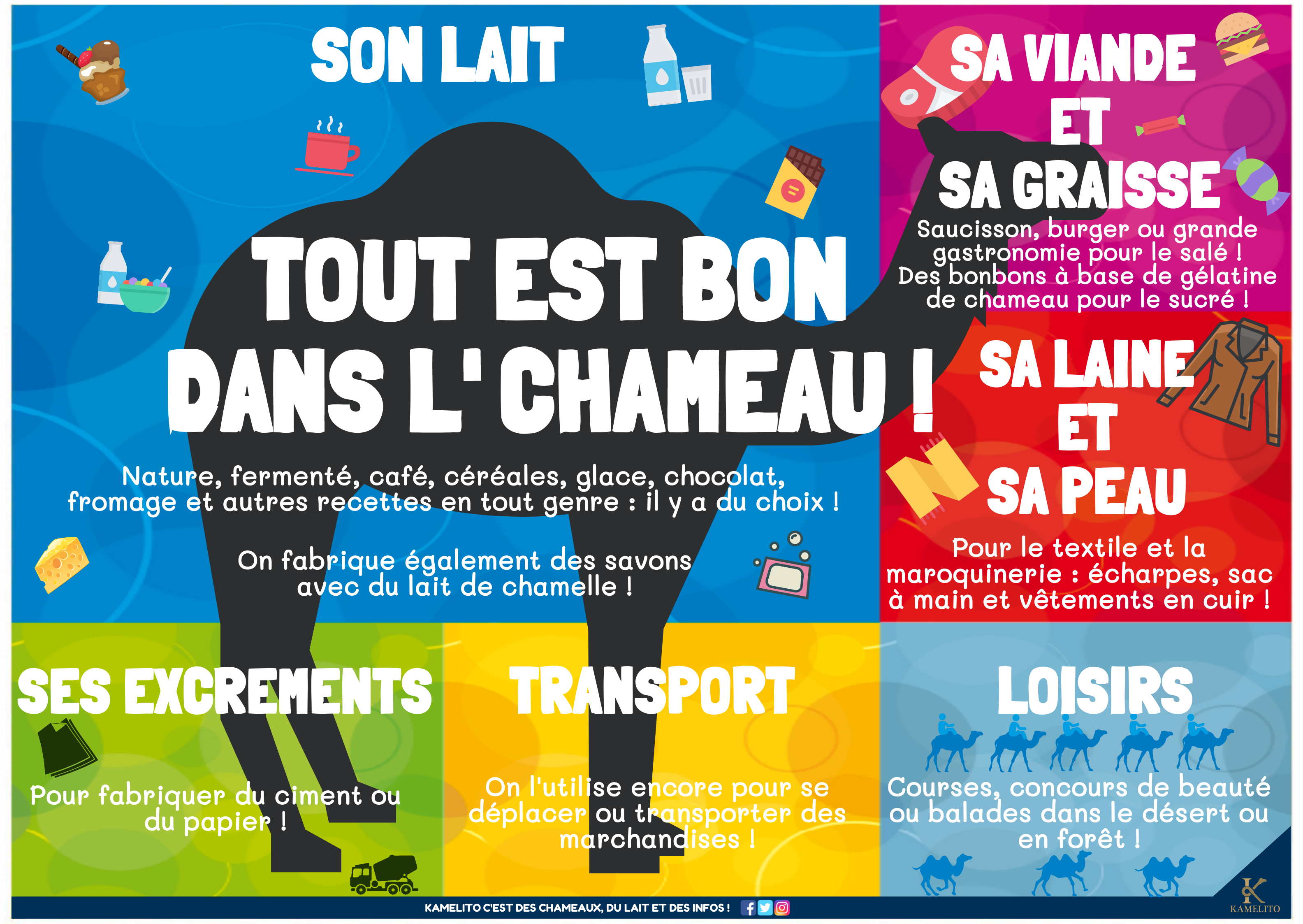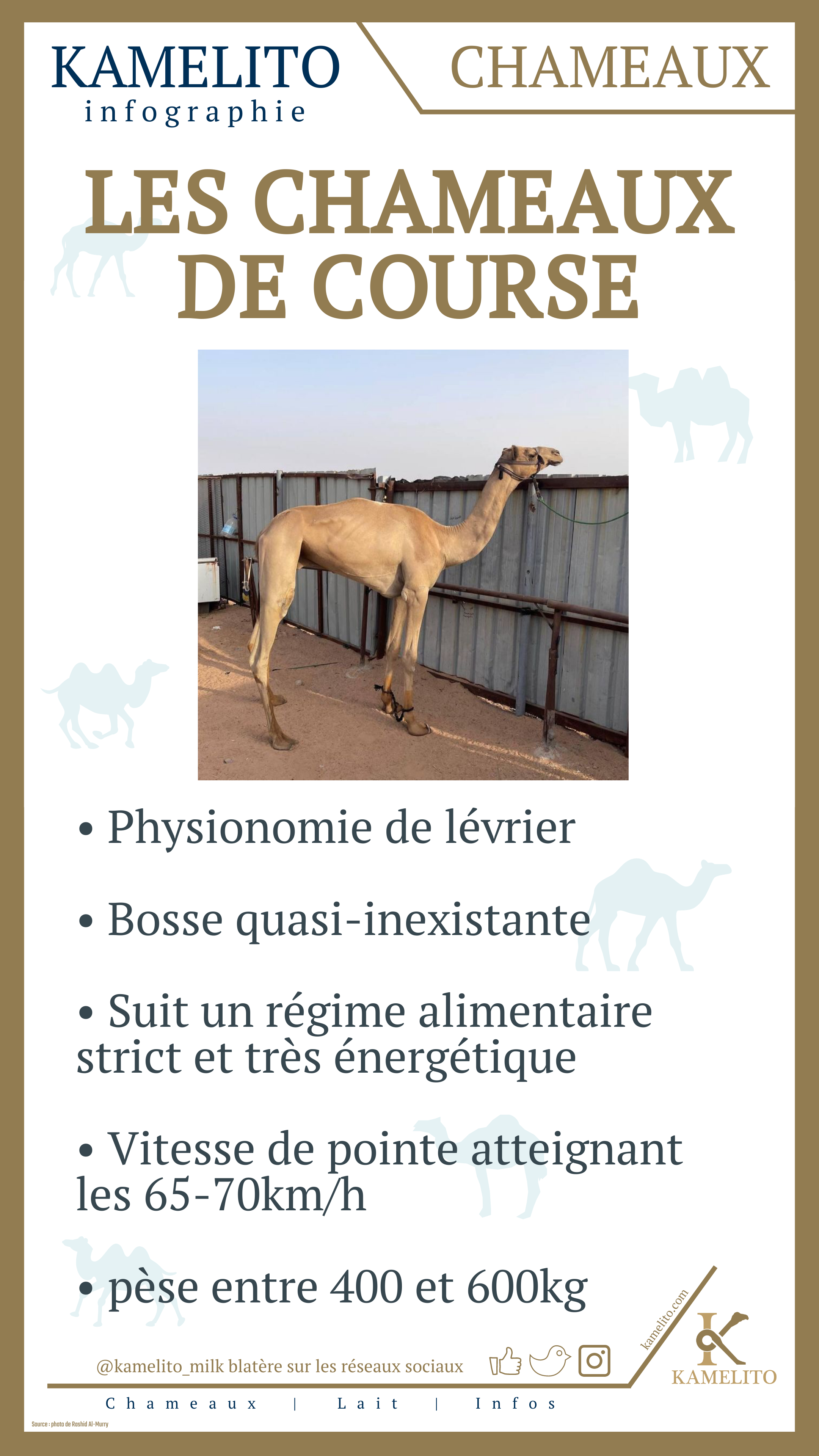 • Le dromadaire, aussi appelé « chameau d’Arabie » ou « chameau à 1 bosse », vit en Afrique, au Moyen-Orient et en Australie.
