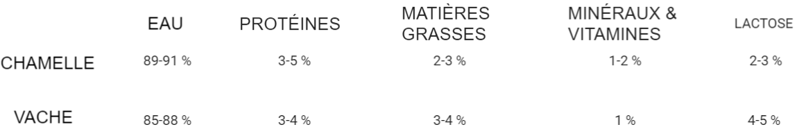Nous pouvons résumer le contenu du lait de chamelle comme ceci :