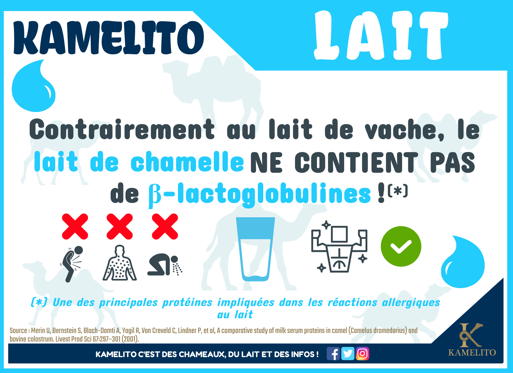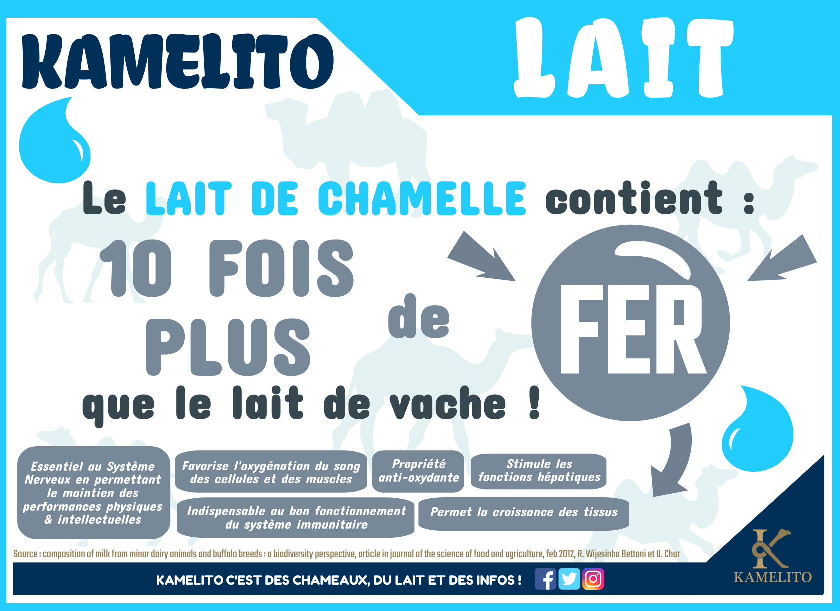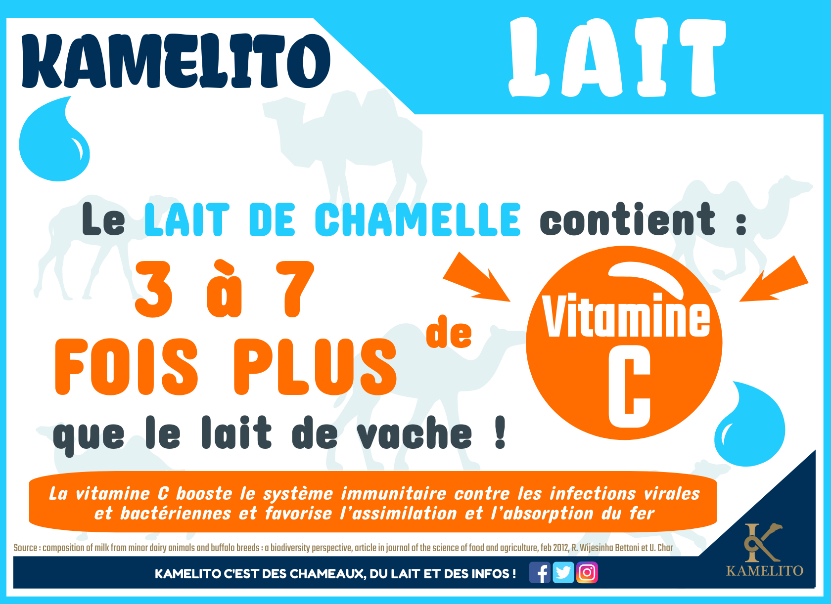 Voir les réponses à ces questions !Composition du lait de chamelle est de manière générale similaire au lait de vache à quelques exceptions près. Les différences vont se situer au niveau de la présence ou non et de la proportion plus ou moins importante de certains nutriments.