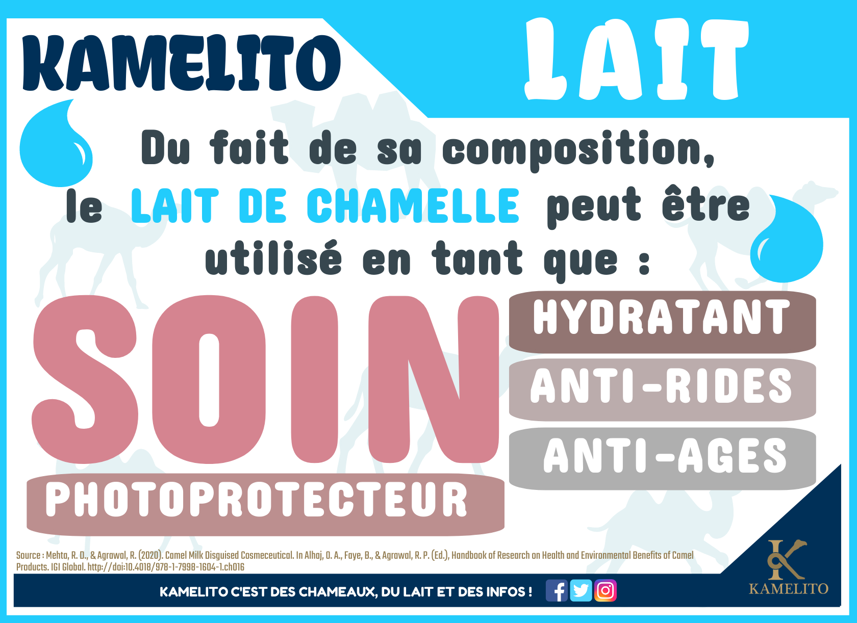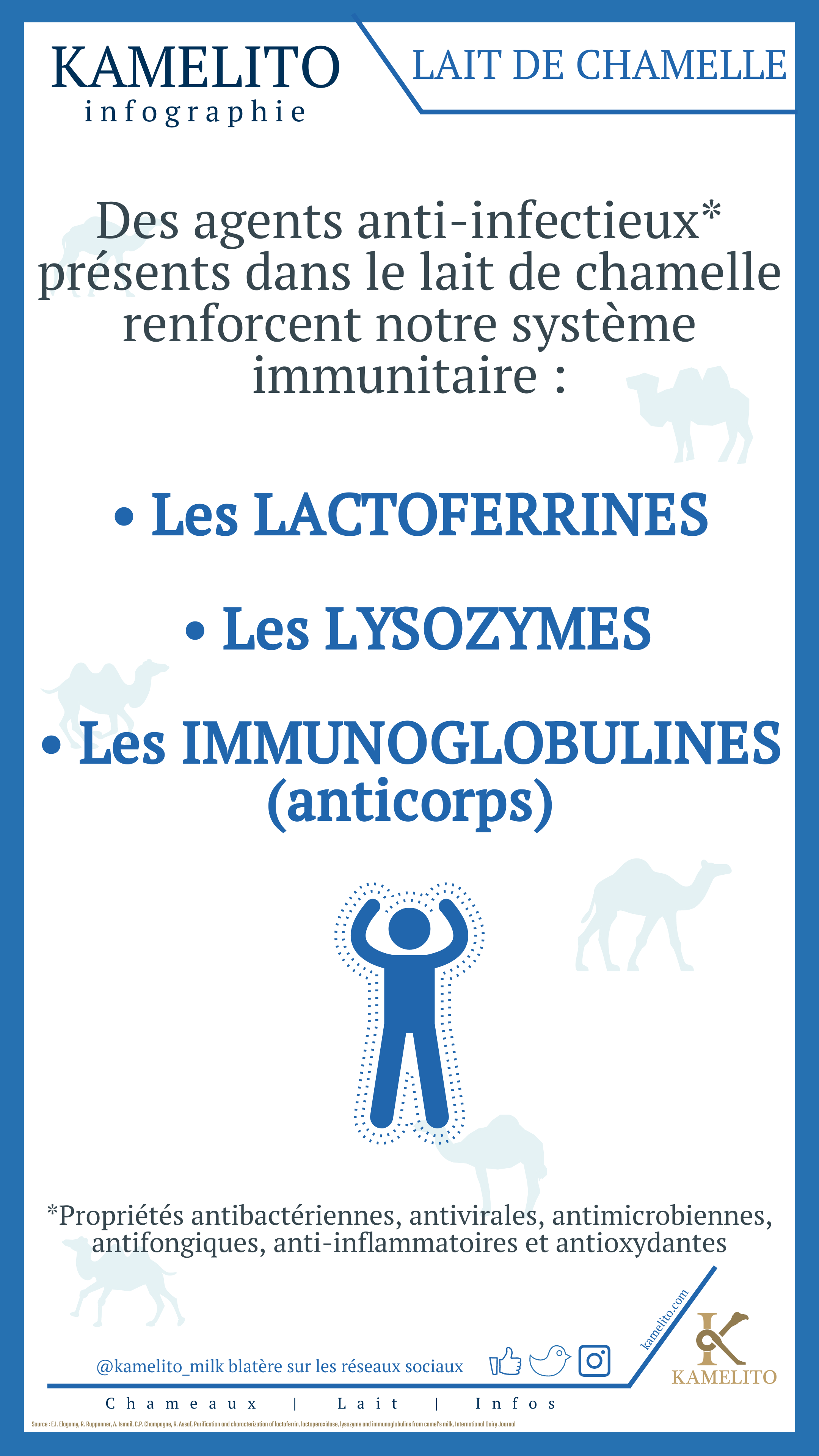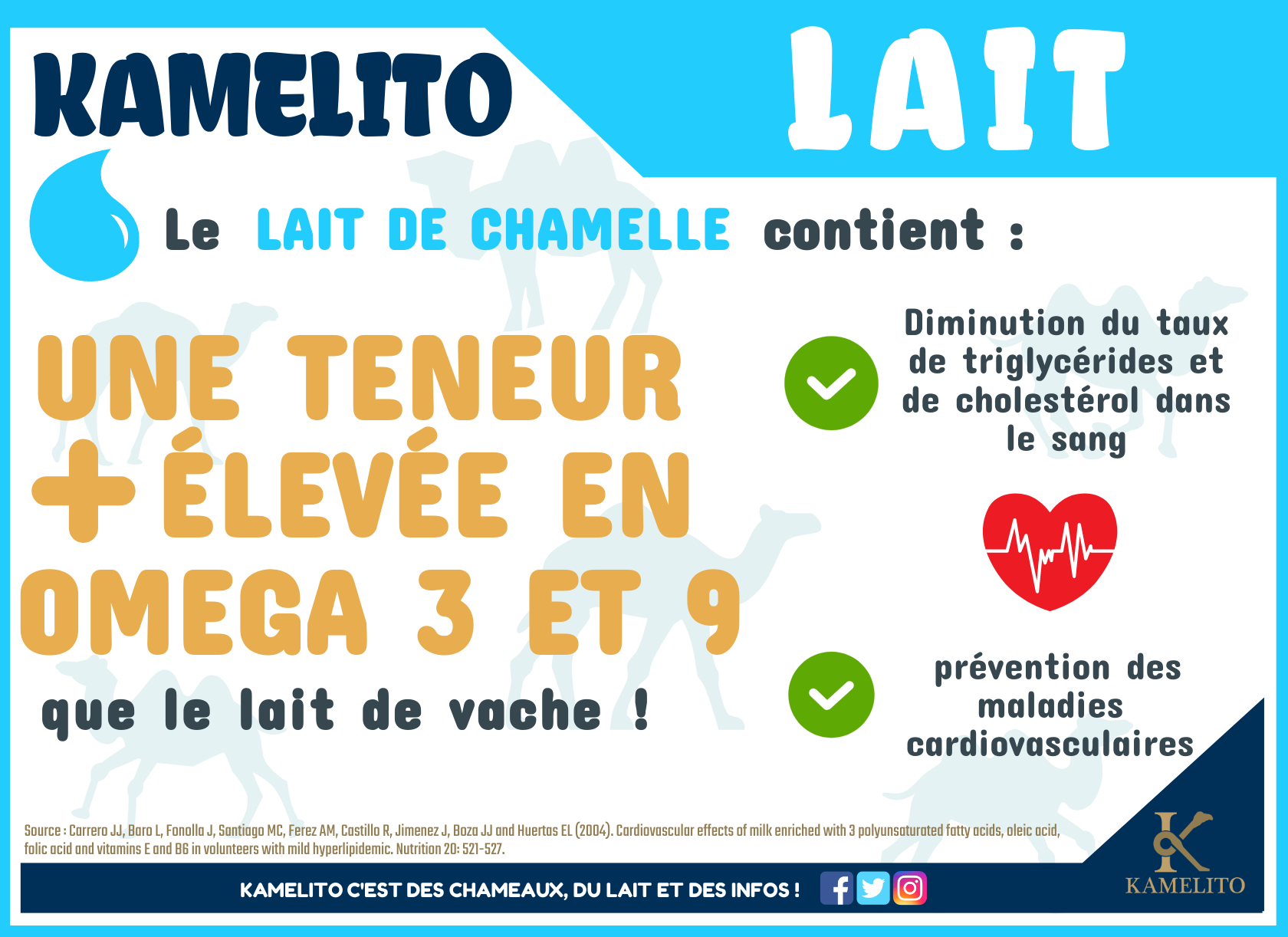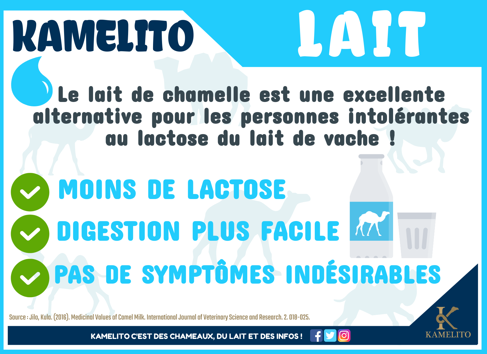 Voir les réponses à ces questions !Composition du lait de chamelle est de manière générale similaire au lait de vache à quelques exceptions près. Les différences vont se situer au niveau de la présence ou non et de la proportion plus ou moins importante de certains nutriments.